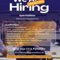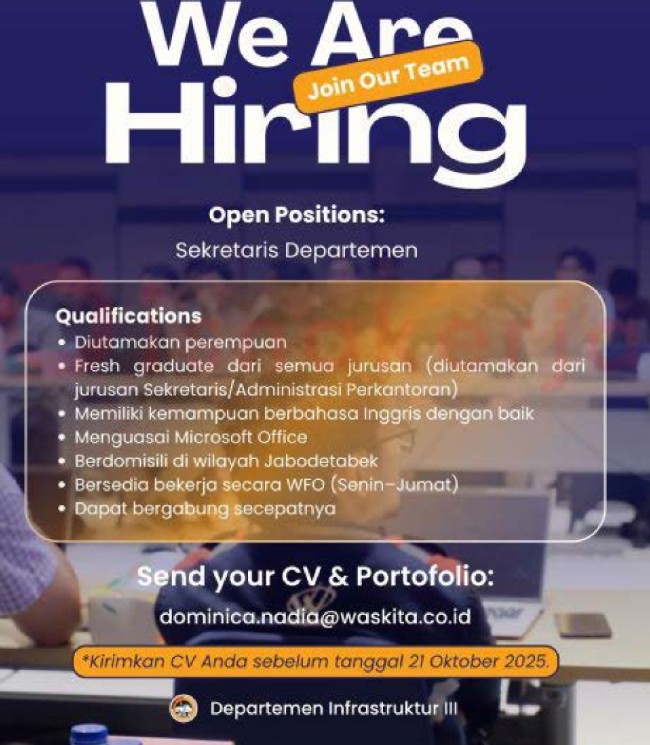 Sebagai perusahaan yang berorientasi pada profesionalisme, integritas, dan keunggulan mutu, Waskita Karya senantiasa membuka kesempatan bagi talenta-talenta muda dan profesional untuk bergabung dan tumbuh bersama. Salah satu peluang karier yang saat ini dibuka adalah posisi Sekretaris Departemen Infrastruktur III, posisi yang memiliki peran penting dalam mendukung kelancaran operasional dan koordinasi kegiatan administrasi di dalam unit kerja.