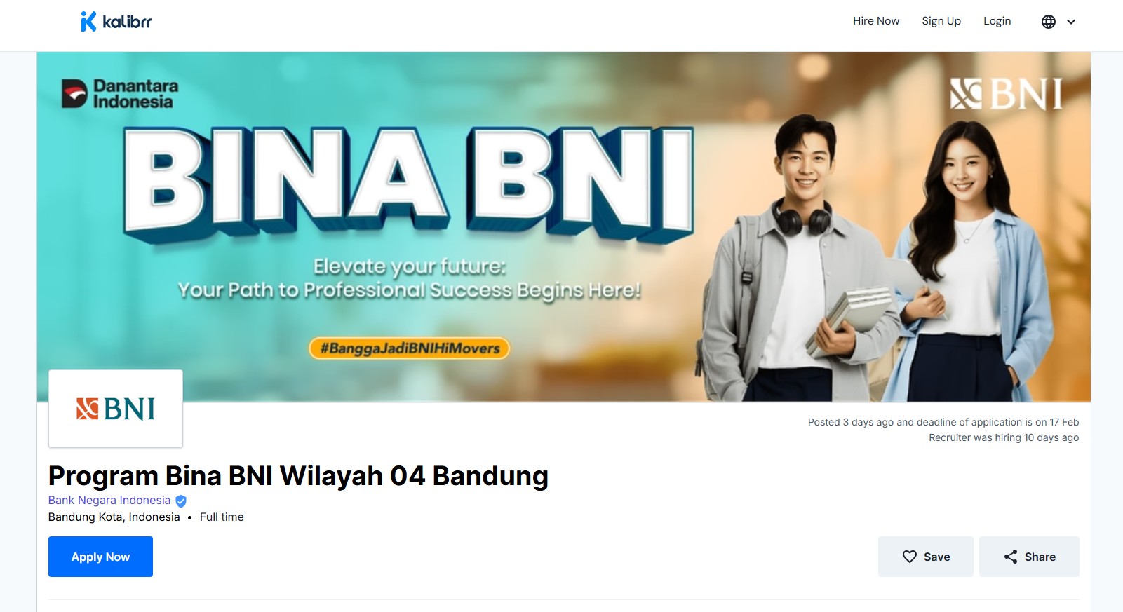 Dalam upaya berkelanjutan untuk berkontribusi terhadap pembangunan sumber daya manusia Indonesia, Bank Negara Indonesia melalui program corporate social responsibility di bidang pendidikan dan ketenagakerjaan kembali membuka kesempatan bagi generasi muda untuk mengikuti Program Pemagangan Bina BNI. Program ini dirancang secara komprehensif untuk memberi peluang kepada lulusan baru yang belum memiliki pengalaman kerja agar dapat memperoleh pelatihan praktis, bimbingan profesional, dan keterampilan yang dibutuhkan untuk terjun ke dunia kerja modern.