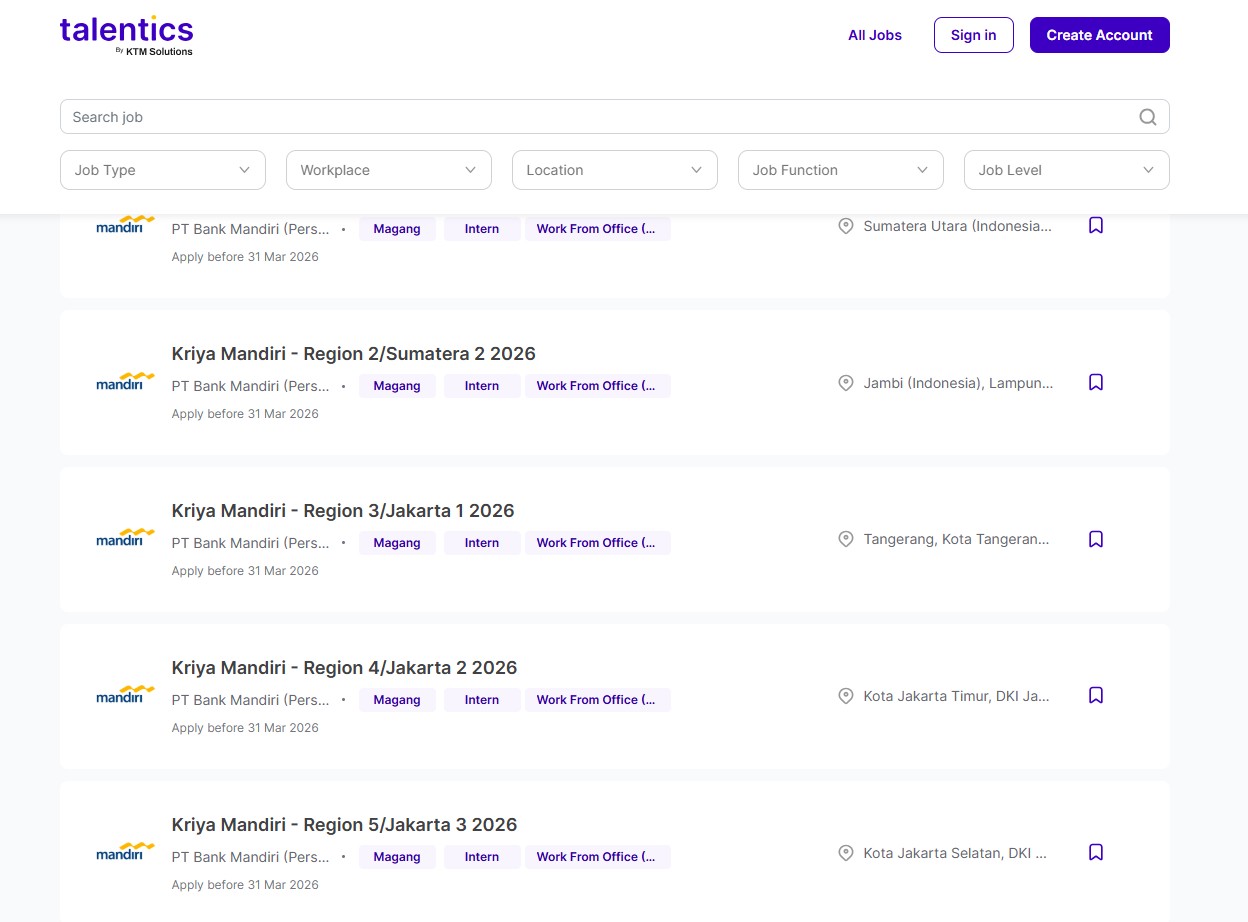 Daftar disini : https://jobs.talentics.id/pt-bank-mandiri-persero-tbk?page=3