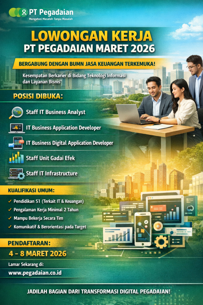 PT Pegadaian kembali membuka peluang karier bagi talenta terbaik Indonesia melalui program rekrutmen terbaru yang dibuka pada bulan Maret 2026. Kesempatan ini ditujukan bagi para profesional muda maupun pencari kerja yang memiliki minat dan kompetensi di bidang teknologi informasi, pengembangan aplikasi digital, analisis bisnis, serta layanan keuangan.