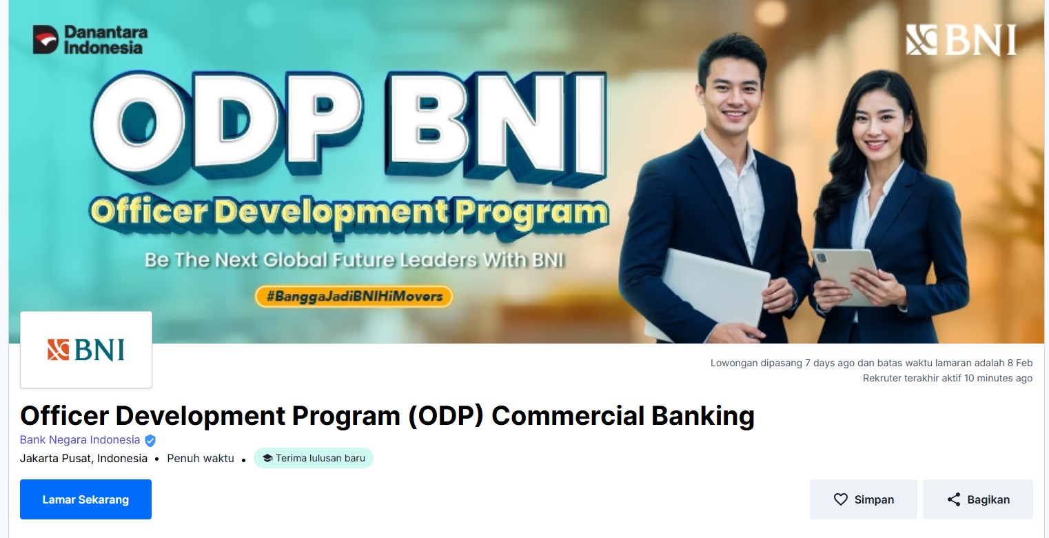 PT Bank Negara Indonesia (Persero) Tbk, atau yang dikenal luas dengan nama BNI, kembali membuka kesempatan berkarier bagi putra-putri terbaik bangsa melalui program Officer Development Program (ODP). Program ini dirancang sebagai jalur percepatan karier untuk mencetak pemimpin masa depan di dunia perbankan Indonesia.