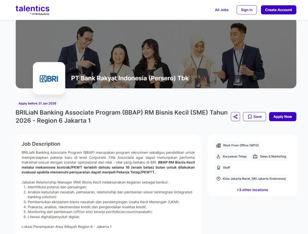 BRI mencari kandidat dengan semangat tinggi, orientasi pelayanan, serta kesiapan bekerja di lapangan.