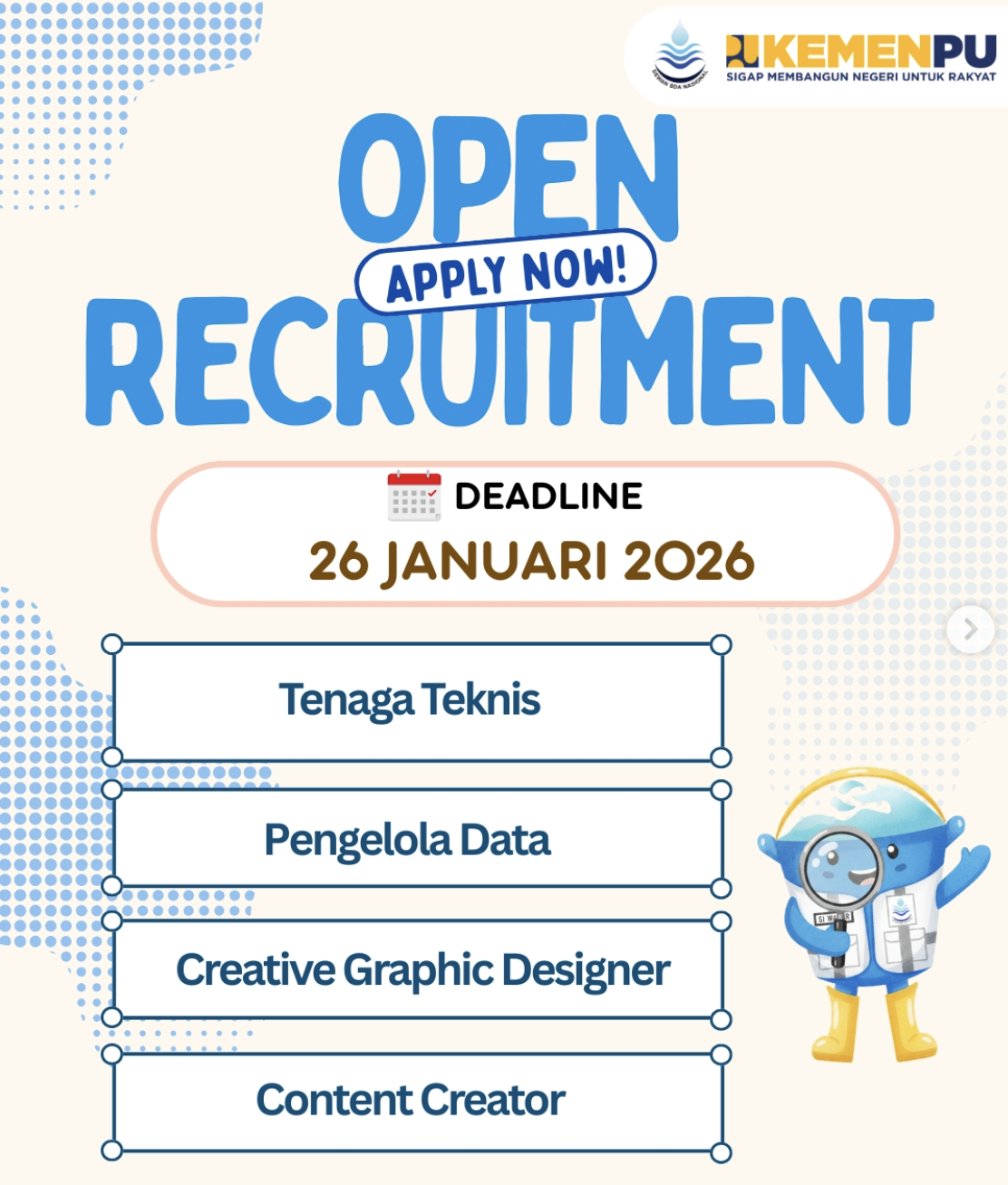 Dalam rangka memperkuat kapasitas organisasi dan mendukung pelaksanaan program kerja tahun anggaran 2026, Sekretariat Dewan Sumber Daya Air Nasional Kementerian Pekerjaan Umum membuka rekrutmen tenaga profesional untuk mengisi beberapa posisi strategis.