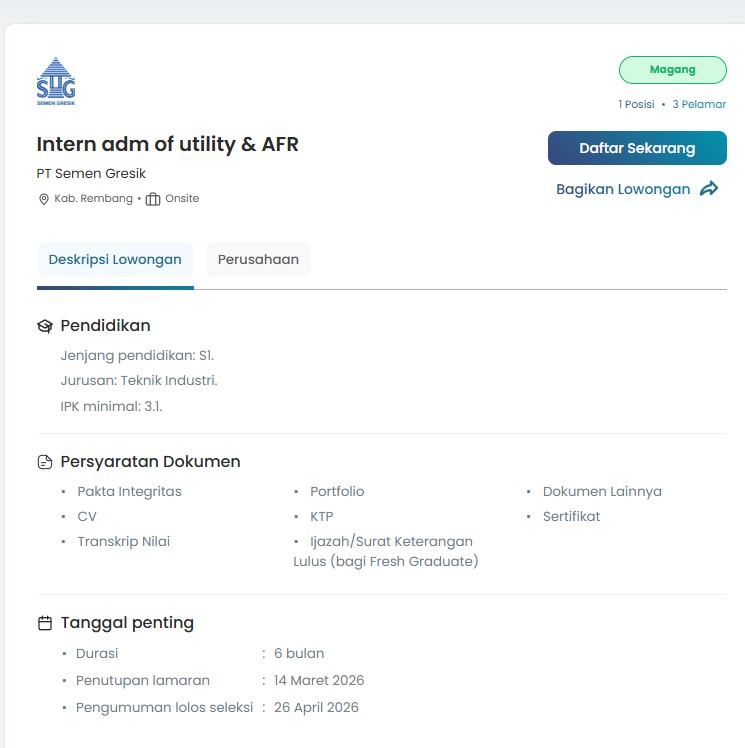 Program magang Intern Administrative of Utility & AFR merupakan salah satu bentuk komitmen PT Semen Gresik dalam mendukung pengembangan kompetensi generasi muda, khususnya mahasiswa dan lulusan baru di bidang teknik industri, manajemen utilitas, administrasi teknis, dan pengelolaan fasilitas produksi. Program ini dirancang secara terstruktur untuk memberikan pengalaman kerja nyata di lingkungan industri semen berskala besar yang beroperasi dengan standar keselamatan, efisiensi, dan keberlanjutan kelas dunia.