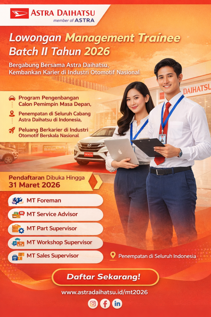 Pendaftaran program Management Trainee Astra Daihatsu Batch II 2026 dibuka hingga 31 Maret 2026, sehingga menjadi kesempatan menarik bagi para lulusan muda yang ingin memulai karier profesional di salah satu perusahaan otomotif terbesar di Indonesia.