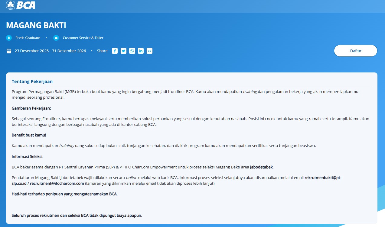 1. Program Pemagangan Bakti – Posisi Frontliner (Customer Service / Teller)