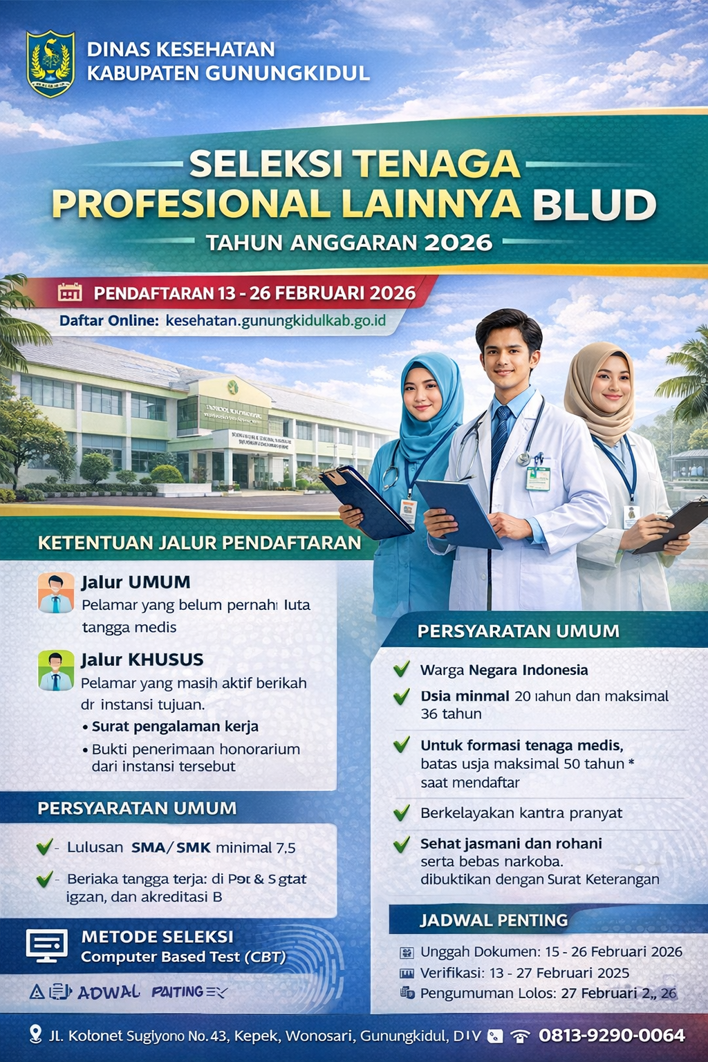 Pembukaan rekrutmen ini merujuk pada Pengumuman Ketua Panitia Seleksi Nomor 800.1/0651/2026 tertanggal 12 Februari 2026. Pengumuman tersebut merupakan tindak lanjut dari Surat Keputusan Bupati Nomor 72 Tahun 2025 yang ditetapkan pada 31 Desember 2025. Keputusan bupati tersebut mengatur kebutuhan formasi Tenaga Profesional Lainnya untuk mendukung optimalisasi kinerja BLUD pada tahun anggaran 2026.