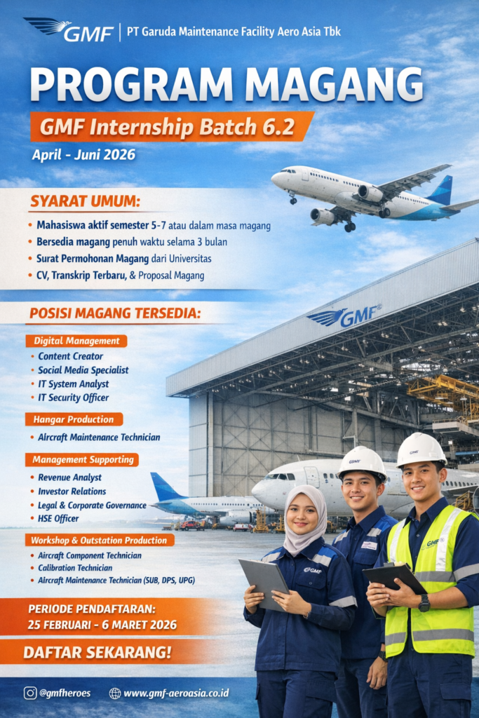 Kabar baik bagi mahasiswa yang ingin mendapatkan pengalaman profesional di industri penerbangan dan perawatan pesawat. Program magang resmi kembali dibuka melalui GMF Internship Batch 6.2 yang akan berlangsung pada periode April hingga Juni 2026. Program ini dirancang untuk memberikan kesempatan belajar langsung di lingkungan kerja profesional bagi mahasiswa aktif dari berbagai jurusan yang relevan dengan kebutuhan industri Maintenance, Repair, and Overhaul (MRO).