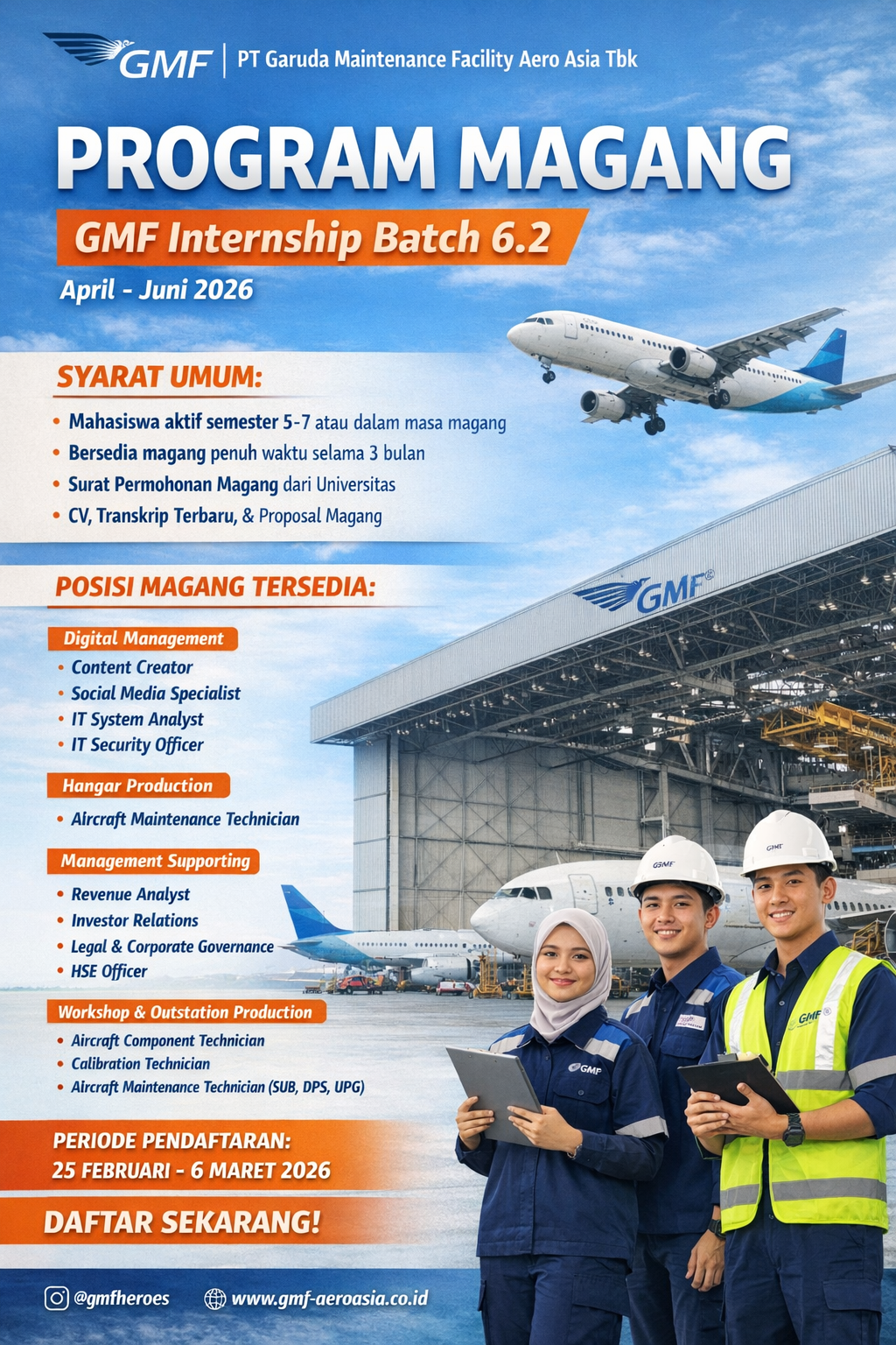 Program GMF Internship Batch 6.2 merupakan program magang profesional yang ditujukan bagi mahasiswa aktif yang ingin memperoleh pengalaman kerja langsung di lingkungan industri penerbangan. Program ini dirancang untuk berlangsung selama minimal tiga bulan, yakni pada periode April hingga Juni 2026, dengan kemungkinan perpanjangan sesuai kebutuhan unit kerja.