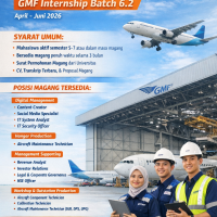 Kabar baik bagi mahasiswa yang ingin mendapatkan pengalaman profesional di industri penerbangan dan perawatan pesawat. Program magang resmi kembali dibuka melalui GMF Internship Batch 6.2 yang akan berlangsung pada periode April hingga Juni 2026. Program ini dirancang untuk memberikan kesempatan belajar langsung di lingkungan kerja profesional bagi mahasiswa aktif dari berbagai jurusan yang relevan dengan kebutuhan industri Maintenance, Repair, and Overhaul (MRO).