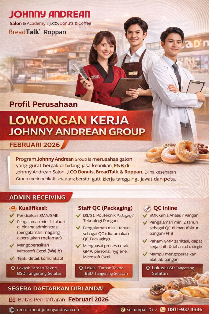 Posisi Staff Quality Control (Packaging) berperan menjamin bahwa seluruh material kemasan yang digunakan oleh Johnny Andrean Group memenuhi standar mutu perusahaan. Dalam bisnis F&B berskala besar, kemasan bukan hanya sarana pembungkus produk, tetapi juga bagian dari identitas brand, media informasi, hingga faktor yang memengaruhi ketahanan produk.