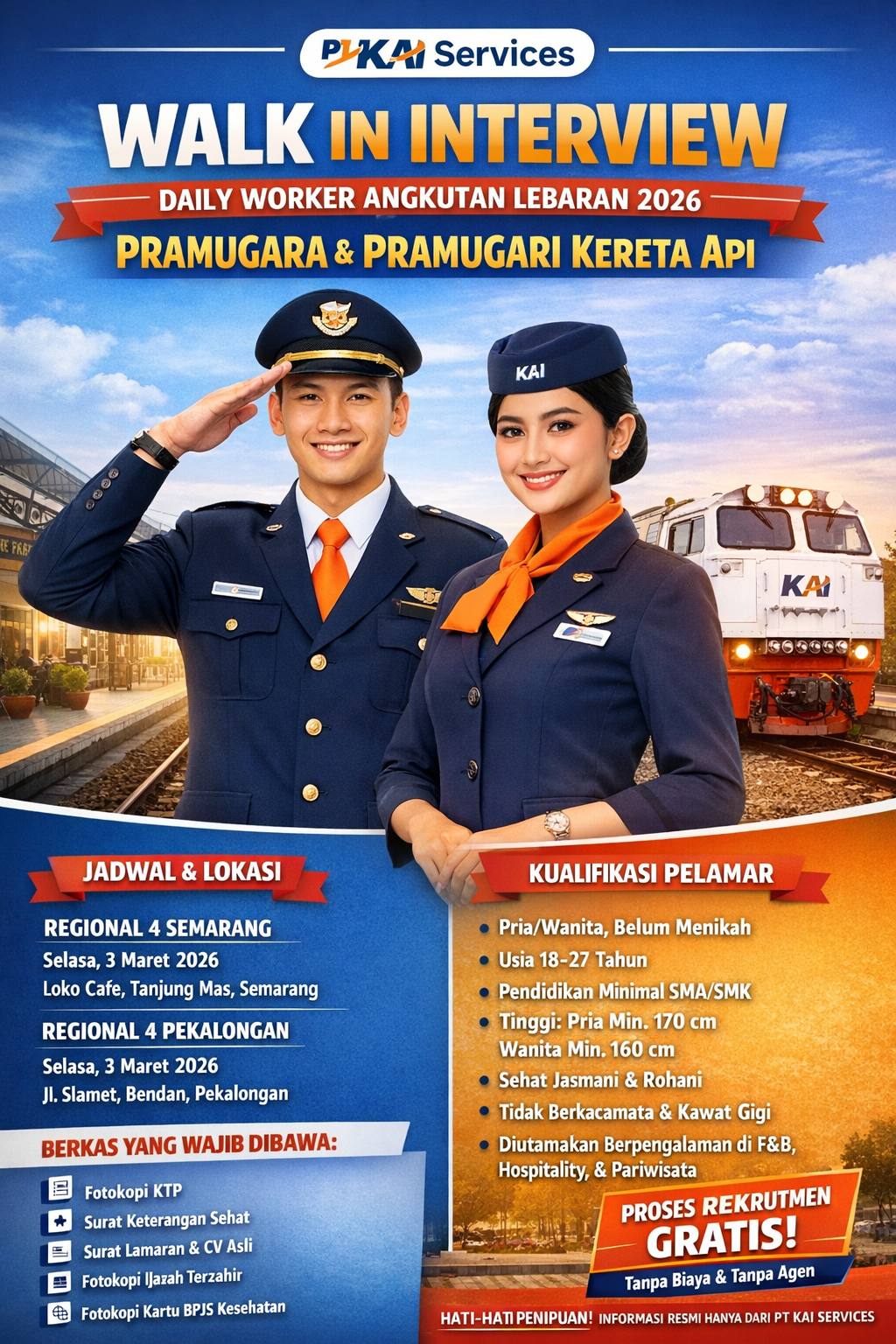 Dalam rangka menyambut periode angkutan Lebaran tahun 2026 yang selalu identik dengan peningkatan mobilitas masyarakat, PT KAI Services membuka kesempatan berkarier bagi talenta muda Indonesia melalui program Walk In Interview untuk posisi Pramugara dan Pramugari sebagai Daily Worker. Program rekrutmen ini dirancang khusus untuk mendukung kelancaran operasional layanan kereta api selama masa angkutan Lebaran agar tetap mengedepankan aspek keamanan, kenyamanan, dan profesionalisme pelayanan kepada pelanggan.