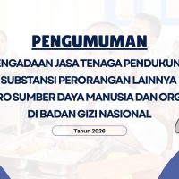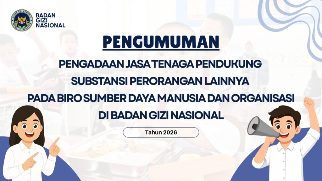 Dalam rangka memperkuat pelaksanaan tugas, fungsi, serta tata kelola internal di lingkungan Biro Sumber Daya Manusia dan Organisasi (BSDMO), Badan Gizi Nasional, kami membuka peluang bagi putra-putri terbaik bangsa untuk bergabung sebagai Tenaga Pendukung Tahun Anggaran 2026. Rekrutmen ini ditujukan bagi para profesional muda yang memiliki komitmen tinggi, etika kerja yang baik, serta minat mendalam dalam mendukung penguatan kualitas sumber daya manusia dan peningkatan kinerja organisasi.