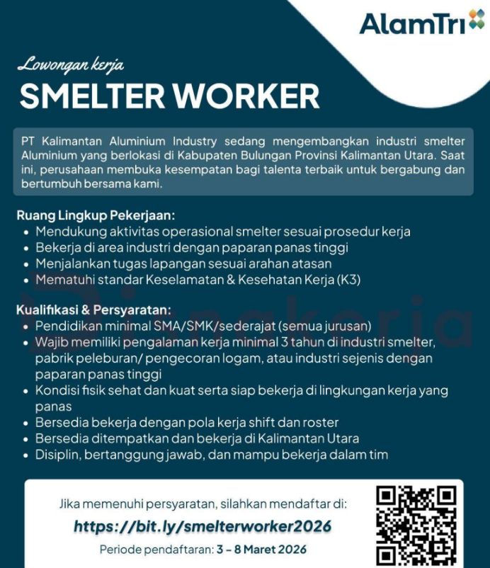 Perusahaan saat ini sedang mencari kandidat terbaik yang siap bekerja di lingkungan industri berat serta memiliki komitmen untuk berkembang bersama perusahaan. Posisi yang dibuka merupakan bagian dari Talent Pool – Smelter Worker, yang nantinya akan mendukung berbagai kegiatan operasional dalam proses produksi aluminium.