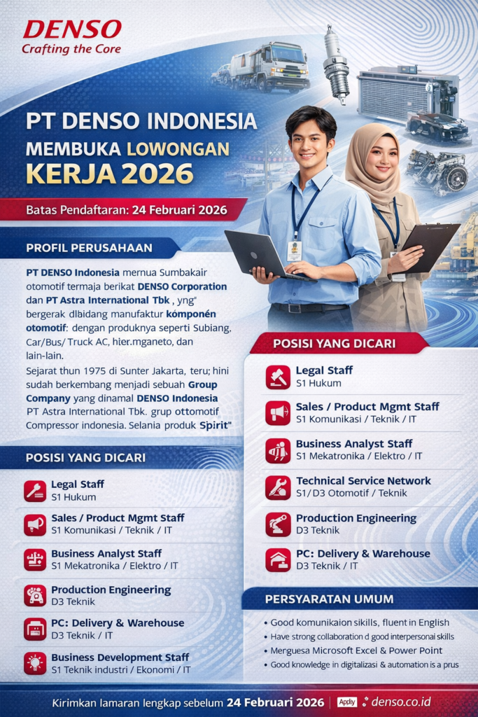 DENSO Indonesia Group membuka peluang bagi individu berbakat, bersemangat, dan siap menghadapi tantangan di dunia industri manufaktur otomotif. Perusahaan mencari kandidat yang kreatif, inovatif, memiliki kemampuan analitis, mampu berkolaborasi dengan baik, serta memiliki orientasi tinggi pada kualitas kerja.