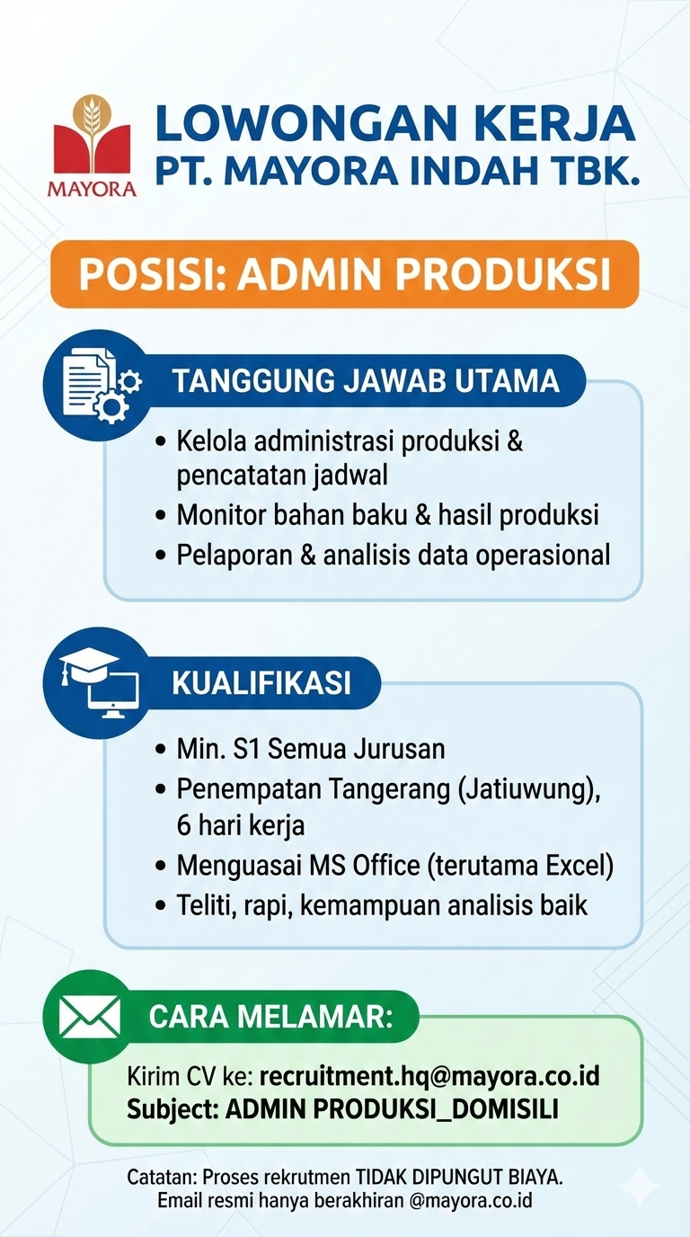 Banyak yang beranggapan bahwa pekerjaan administrasi di pabrik hanya berkutat pada kertas. Namun, di PT Mayora Indah Tbk., posisi Admin Produksi adalah “otak” di balik kelancaran lantai produksi. Anda adalah jembatan antara manajemen operasional, ketersediaan bahan baku, dan target hasil produksi.