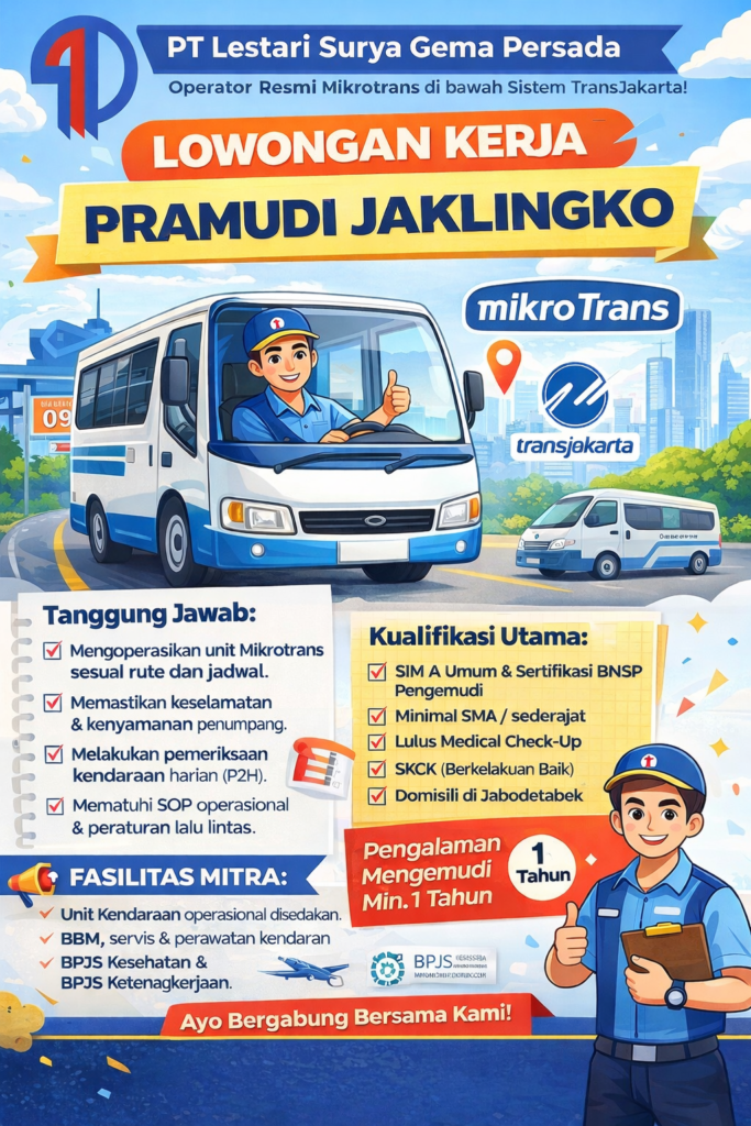 Untuk mendukung operasional transportasi publik yang terus berkembang, PT Lestari Surya Gema Persada membuka kesempatan kemitraan bagi kandidat yang ingin bergabung sebagai Pramudi JakLingko (Mikrotrans).