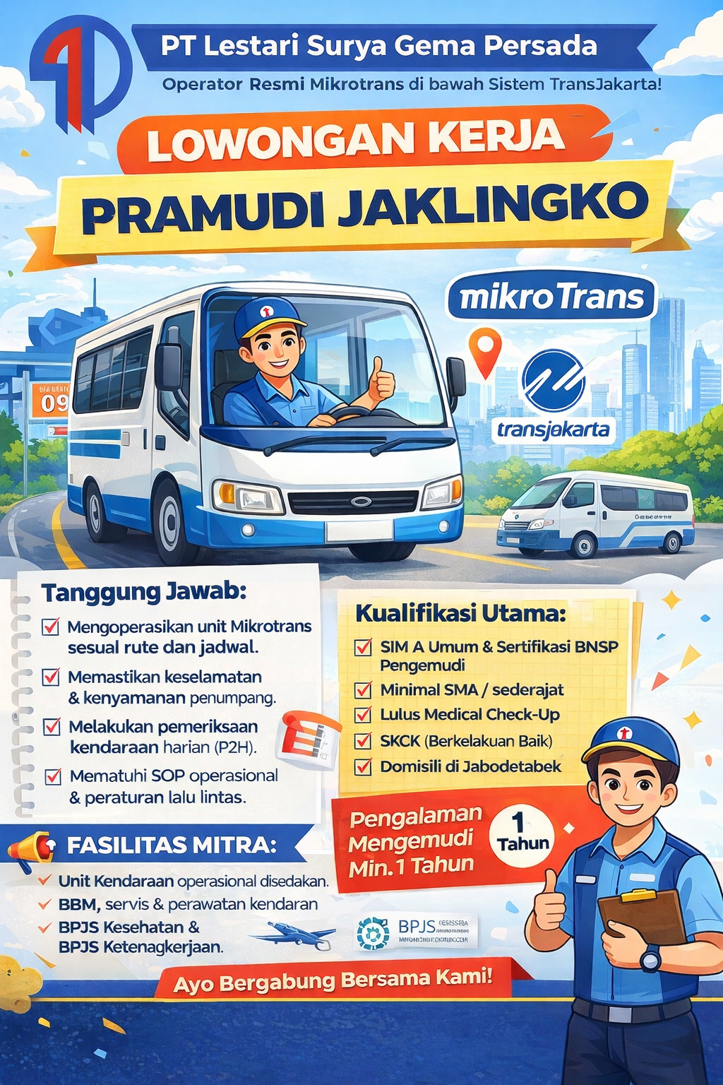 Bergabunglah bersama PT Lestari Surya Gema Persada dan jadilah bagian dari sistem transportasi publik JakLingko yang mendukung mobilitas masyarakat melalui jaringan layanan TransJakarta.