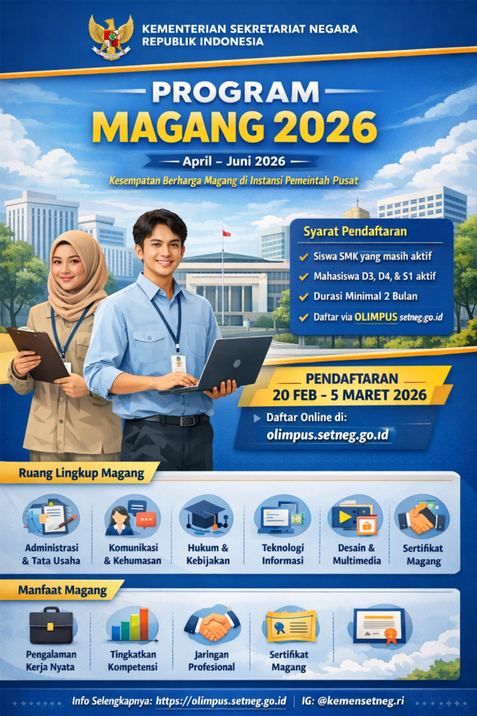 Sebagai salah satu lembaga yang memiliki fungsi strategis dalam mendukung penyelenggaraan pemerintahan dan pelayanan kepada Presiden serta Wakil Presiden, Kementerian Sekretariat Negara Republik Indonesia kembali membuka kesempatan berharga bagi para pelajar dan mahasiswa untuk mengikuti Program Magang Kuartal II Tahun 2026. Program ini disiapkan untuk memberikan pengalaman belajar yang komprehensif di lingkungan kerja pemerintahan, terutama bagi generasi muda yang ingin mengenal lebih dekat dunia kerja di sektor publik.