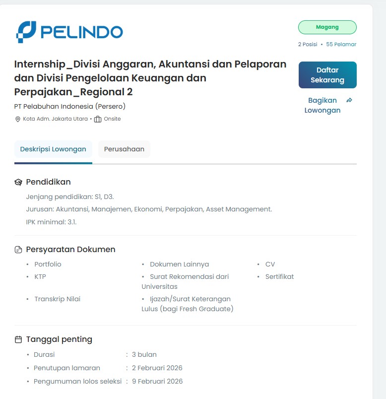 Regional 2 Pelindo merupakan salah satu wilayah operasional penting yang memiliki aktivitas pelabuhan padat dan kompleks. Regional ini menjadi pusat pengelolaan kegiatan keuangan operasional, investasi aset, pelaporan kinerja, hingga kepatuhan perpajakan perusahaan. Oleh karena itu, Pelindo membuka kesempatan bagi talenta muda untuk bergabung melalui Program Internship Divisi Anggaran, Akuntansi & Pelaporan serta Divisi Pengelolaan Keuangan & Perpajakan.