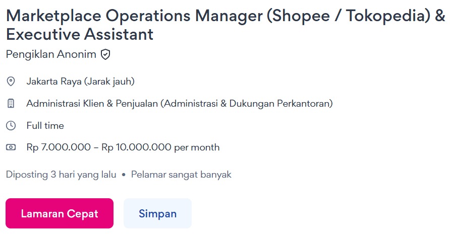 Nama Posisi: Marketplace Operations Manager (Shopee / Tokopedia) & Executive Assistant