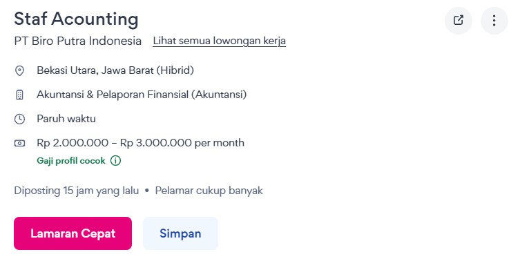 PT Biro Putra Indonesia, sebuah perusahaan yang bergerak di bidang penyediaan layanan akuntansi, pelaporan finansial, serta konsultasi keuangan, saat ini membuka kesempatan bagi Anda yang memiliki ketertarikan dan kompetensi di dunia keuangan untuk bergabung sebagai Staf Accounting. Posisi ini ditempatkan di kantor pusat yang berlokasi di kawasan Bekasi Utara, wilayah yang terus tumbuh sebagai salah satu pusat aktivitas bisnis dan industri di Jawa Barat.