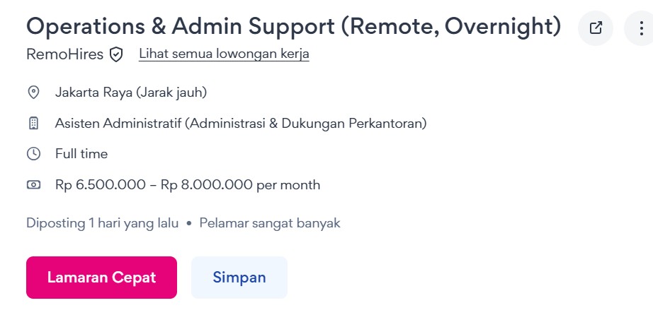 Dengan semakin tingginya kebutuhan perusahaan global terhadap dukungan operasional yang efisien selama 24 jam, RemoHires memperluas timnya dan membuka kesempatan kerja untuk posisi Operations & Admin Support (Remote, Overnight), sebuah posisi penting yang berperan langsung dalam menjaga kelancaran operasional klien selama jam malam Waktu Indonesia Barat.