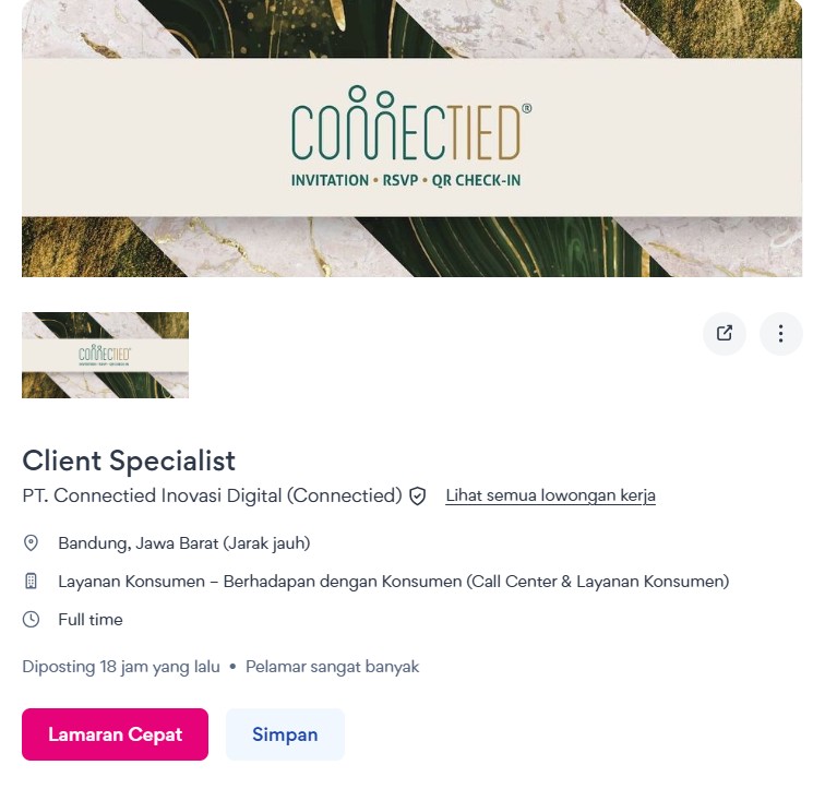 Guna menunjang pertumbuhan dan memperkuat kualitas pelayanan, Connectied membuka kesempatan bagi individu profesional untuk bergabung sebagai Client Specialist, sebuah posisi yang berperan penting sebagai garda depan perusahaan dalam memberikan pelayanan terbaik kepada klien.