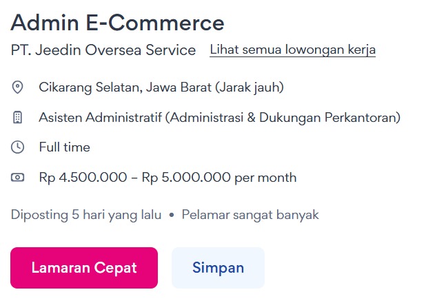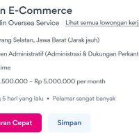 Seiring dengan ekspansi dan peningkatan volume pekerjaan pada berbagai platform e-commerce, saat ini PT Jeedin Oversea Service membuka kesempatan bergabung bagi kandidat terbaik untuk mengisi posisi Admin E-Commerce dengan sistem kerja Work From Home (WFH).