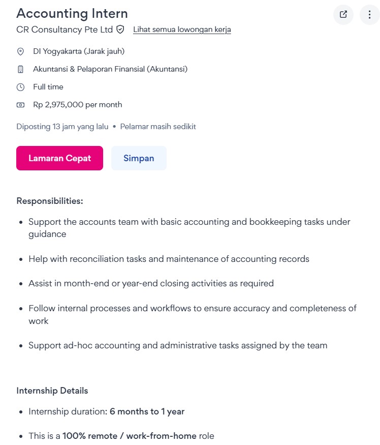 Rekrutmen ini merupakan peluang berharga untuk memahami bagaimana praktik akuntansi dijalankan dalam lingkungan bisnis internasional, khususnya pada perusahaan yang melayani klien di Singapura dengan standar kepatuhan dan kualitas yang sangat ketat.